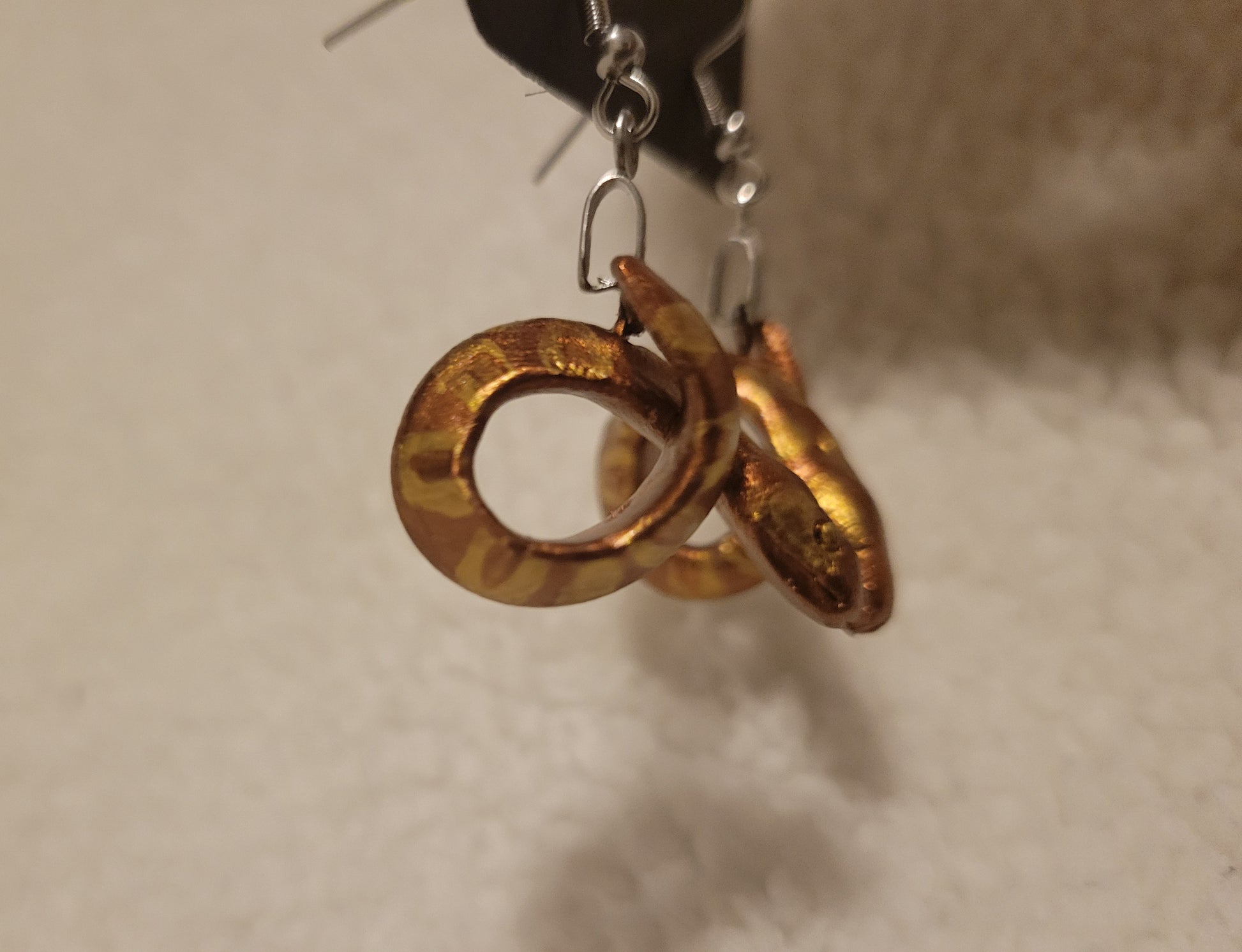 These earrings are hand-sculpted and painted with care, shaped to look like the ball python we all know and love. While shaped to be durable, they are bigger than most, and wouldn't be comfortable when sleeping.