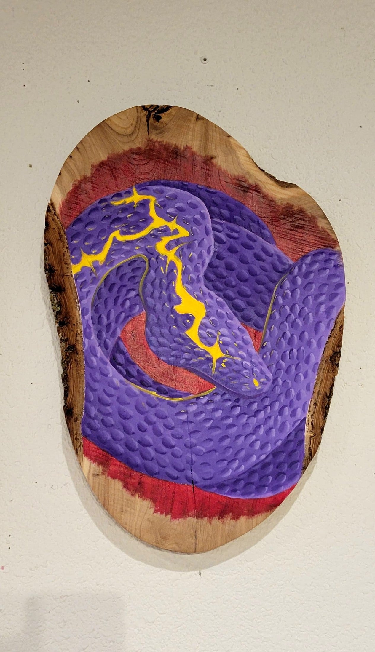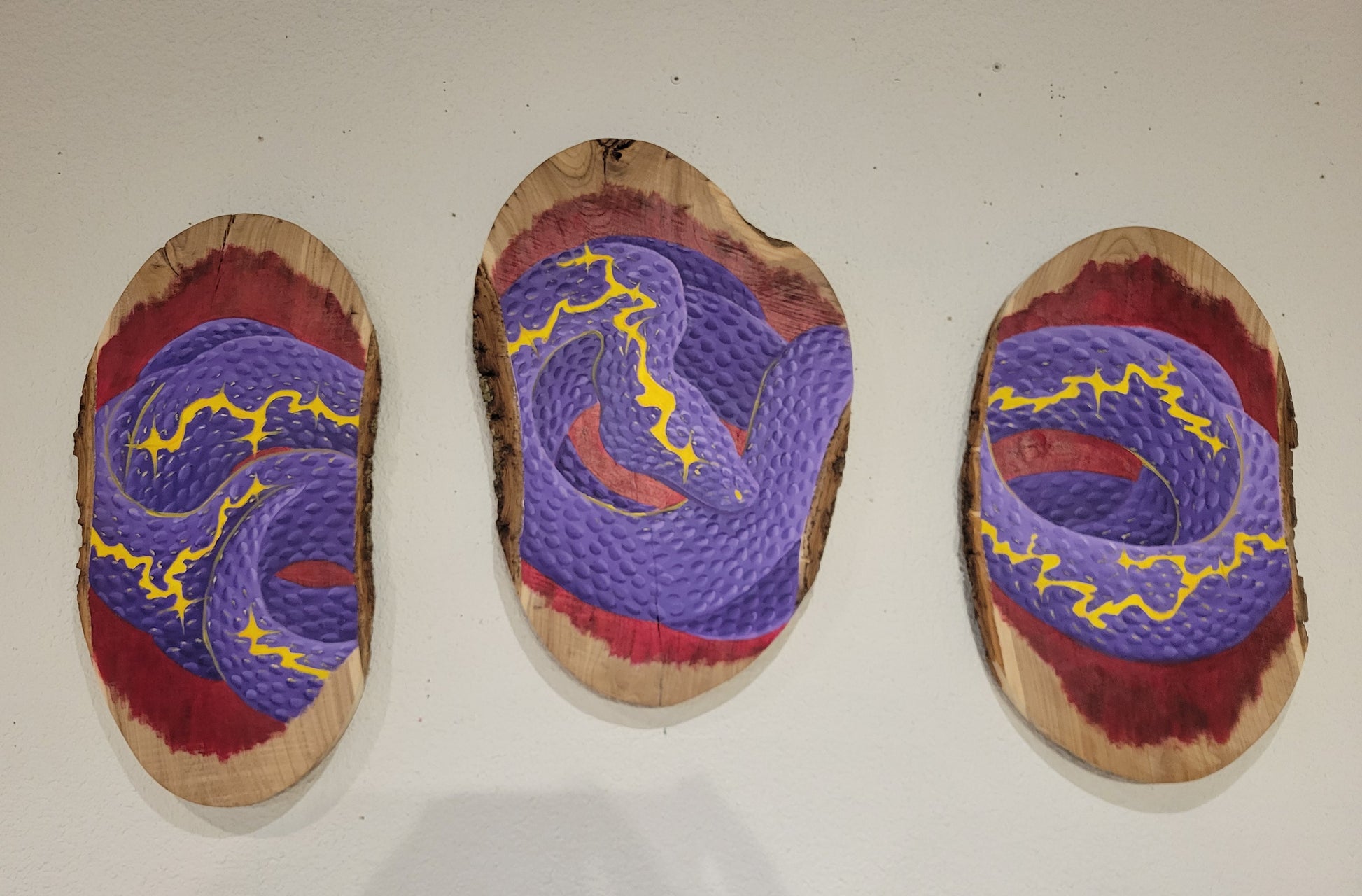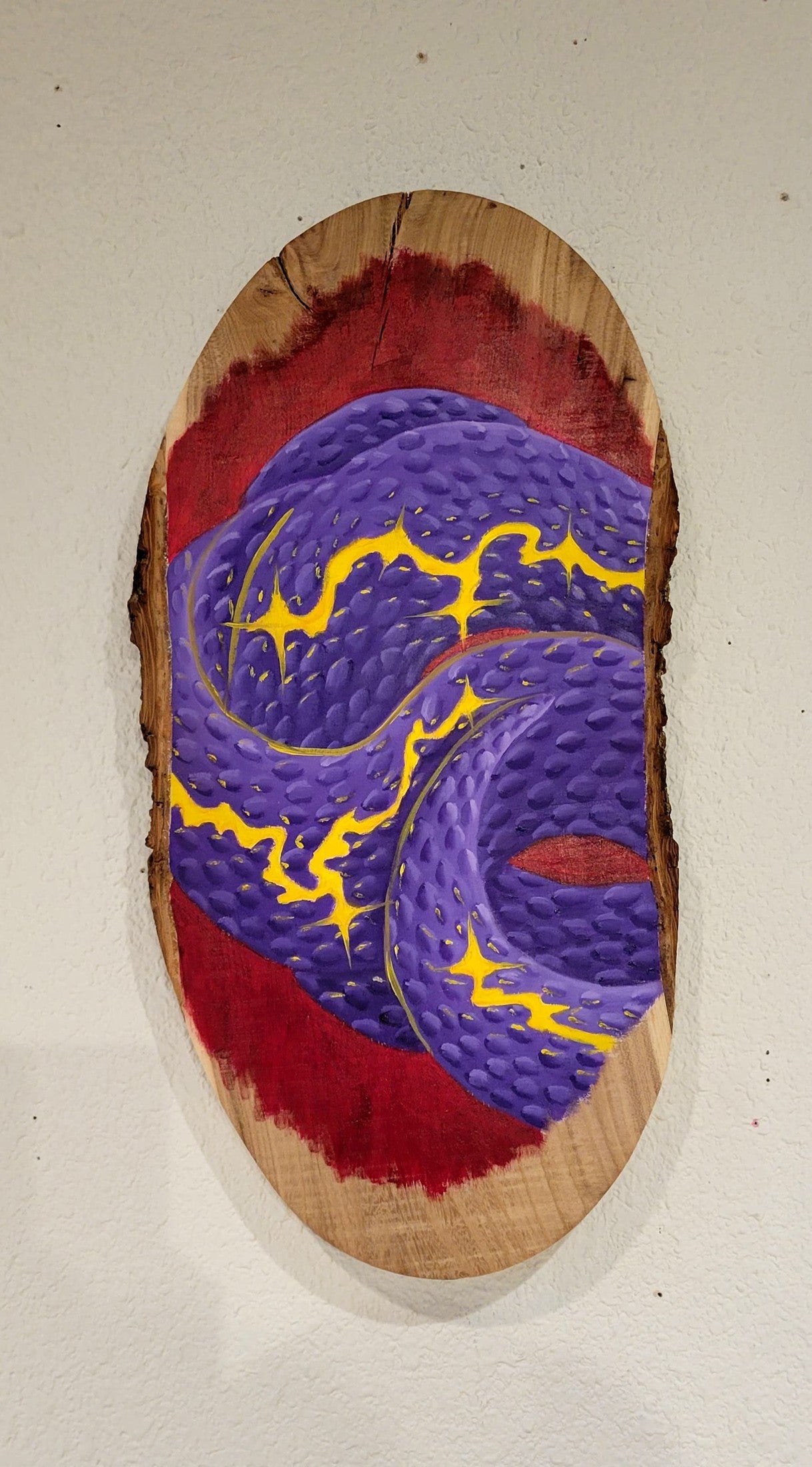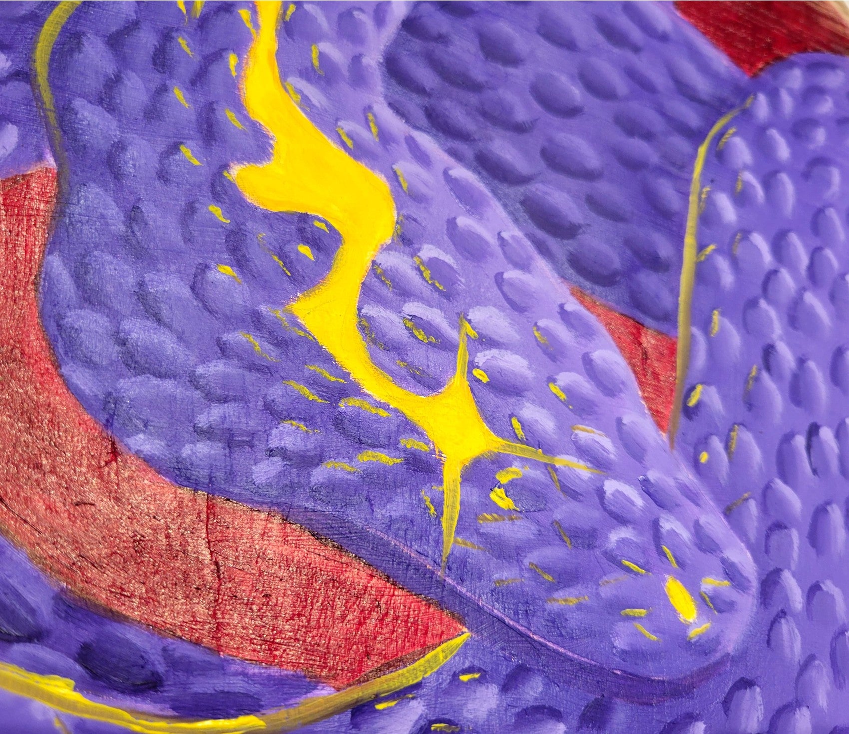 "Beholder" is an original 3-part oil painting that depicts a boa constrictor with the chimera (has also been called mosaicism) skin mutation.